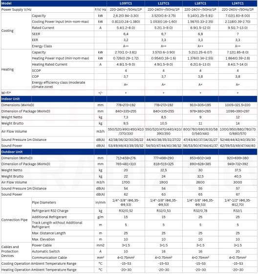Jauda: L09TC1 2.62 (0.94-3.30) kW, L12TC1 3.520 (0.6-3.75) kW, L18TC1 5.140 (1.25-5.91), L24TC1 7.02 (1.83-8.00)